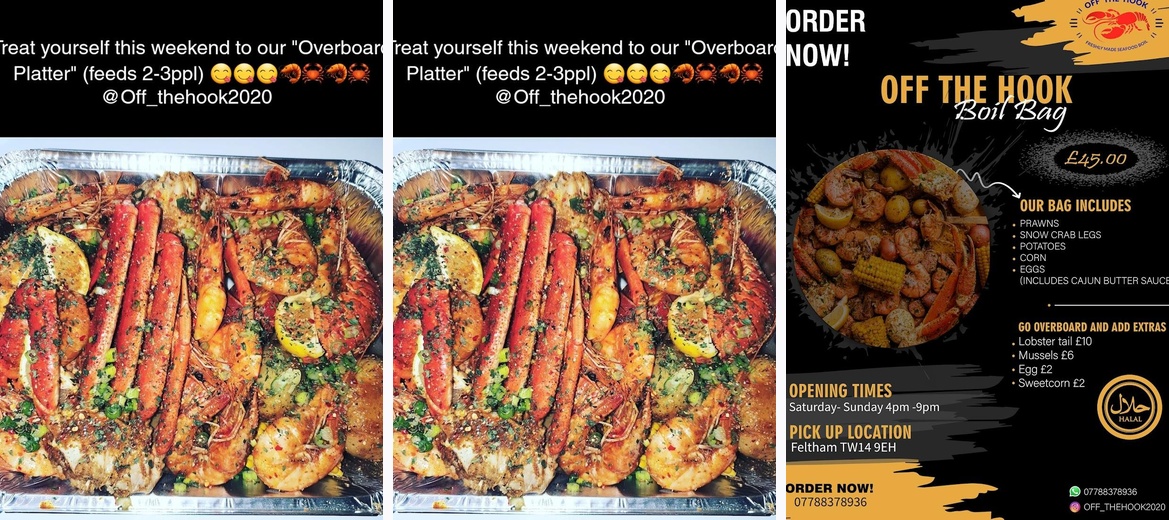Welcome to Off the Hook - Seafood Boil, your go-to destination for mouthwatering seafood delivered straight from our kitchen in Feltham. Specializing in delectable boil bags and platters, we serve up a tantalizing selection of jumbo prawns, succulent snow crab legs, and lobster tails, all generously coated in our signature Cajun butter sauce. Please note, we operate on a pre-order basis with a minimum 24-hour notice for collection or delivery. Perfect for events and celebrations, indulge in a seafood feast that's sure to impress. Follow us on Instagram @OFF_THEHOOK2020 and taste the difference today!The flavor-packed Cajun butter sauce is a top favorite, enhancing every seafood selection. Customers rave about the freshness of all ingredients, especially the juicy prawns and sweet snow crab legs, making each bite unforgettable. Generous portion sizes ensure a satisfying meal that can be shared or enjoyed solo. Flexibility in service, with a combination of collection and delivery options, makes it easy for those who prefer to dine at home or on the go. Effective communication from the staff also stands out, with timely updates on orders adding a personal touch. Plus, their emphasis on creating memorable experiences for celebrations makes Off The Hook a popular choice for events.