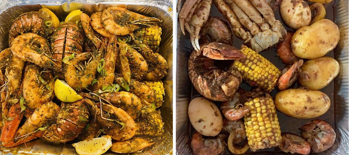 Off The Hook serves delectable seafood boil bags and platters featuring jumbo prawns, snow crab legs, crab claws, and lobster tails, all slathered in their signature cajun butter sauce.